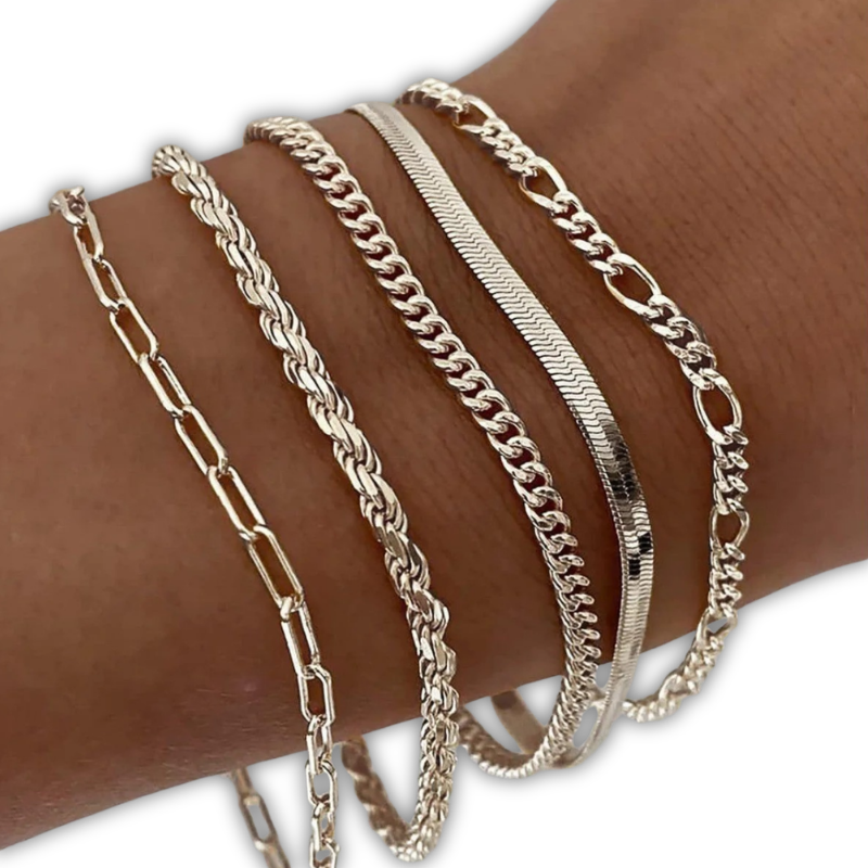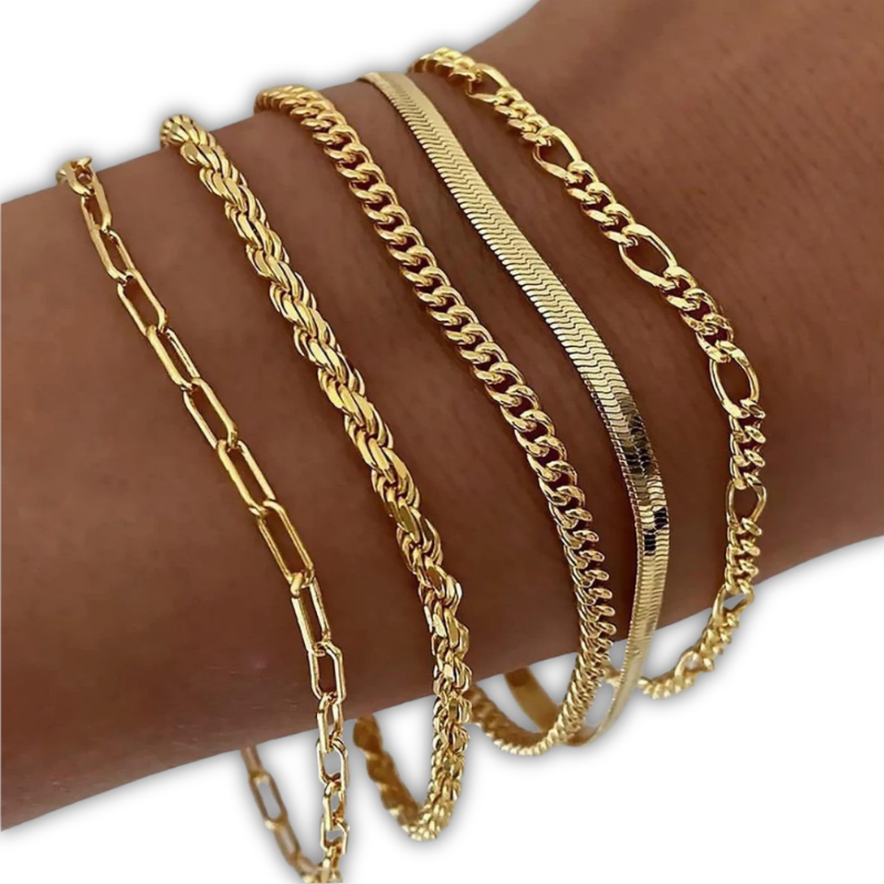 Η Juna συνδυάζει πέντε λεπτά χρυσά βραχιόλια σε ένα αρμονικό σύνολο γεμάτο σύγχρονη ελαφρότητα.