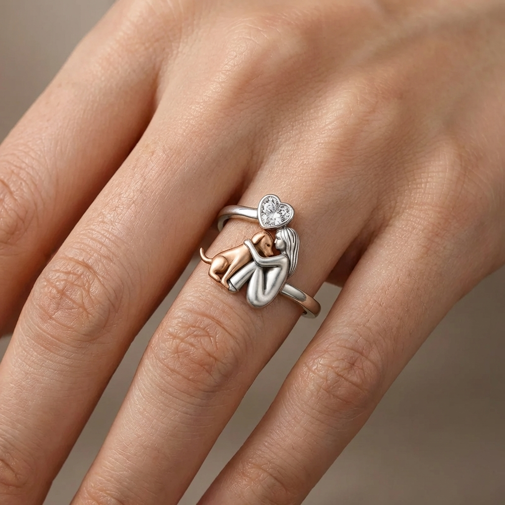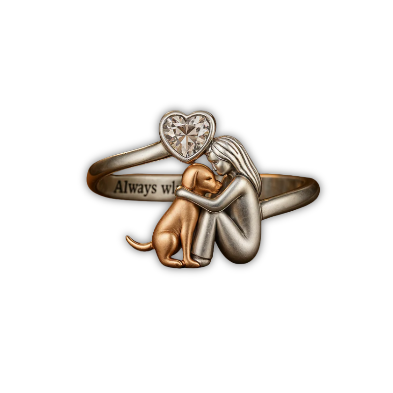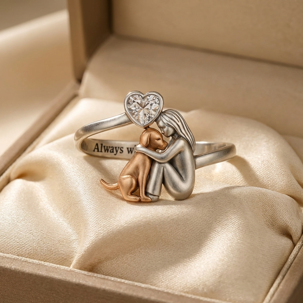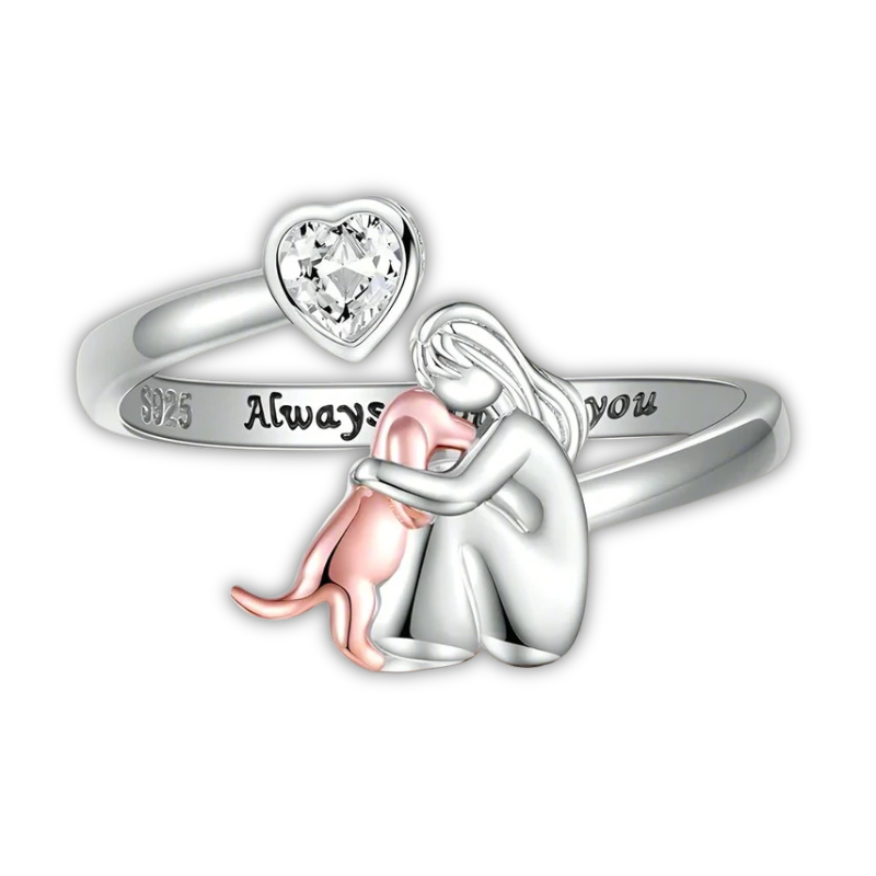 Αυτό το συγκινητικό δαχτυλίδι είναι φτιαγμένο από ασήμι 925, διακοσμημένο με ζιρκόνιο, και φέρει την επιγραφή "Πάντα στην καρδιά μου". Ο σχεδιασμός απεικονίζει μια τρυφερή αγκαλιά μεταξύ ενός κοριτσιού και του σκύλου της, συμβολίζοντας τον δεσμό μεταξύ του ανθρώπου και του πιστού φίλου του.