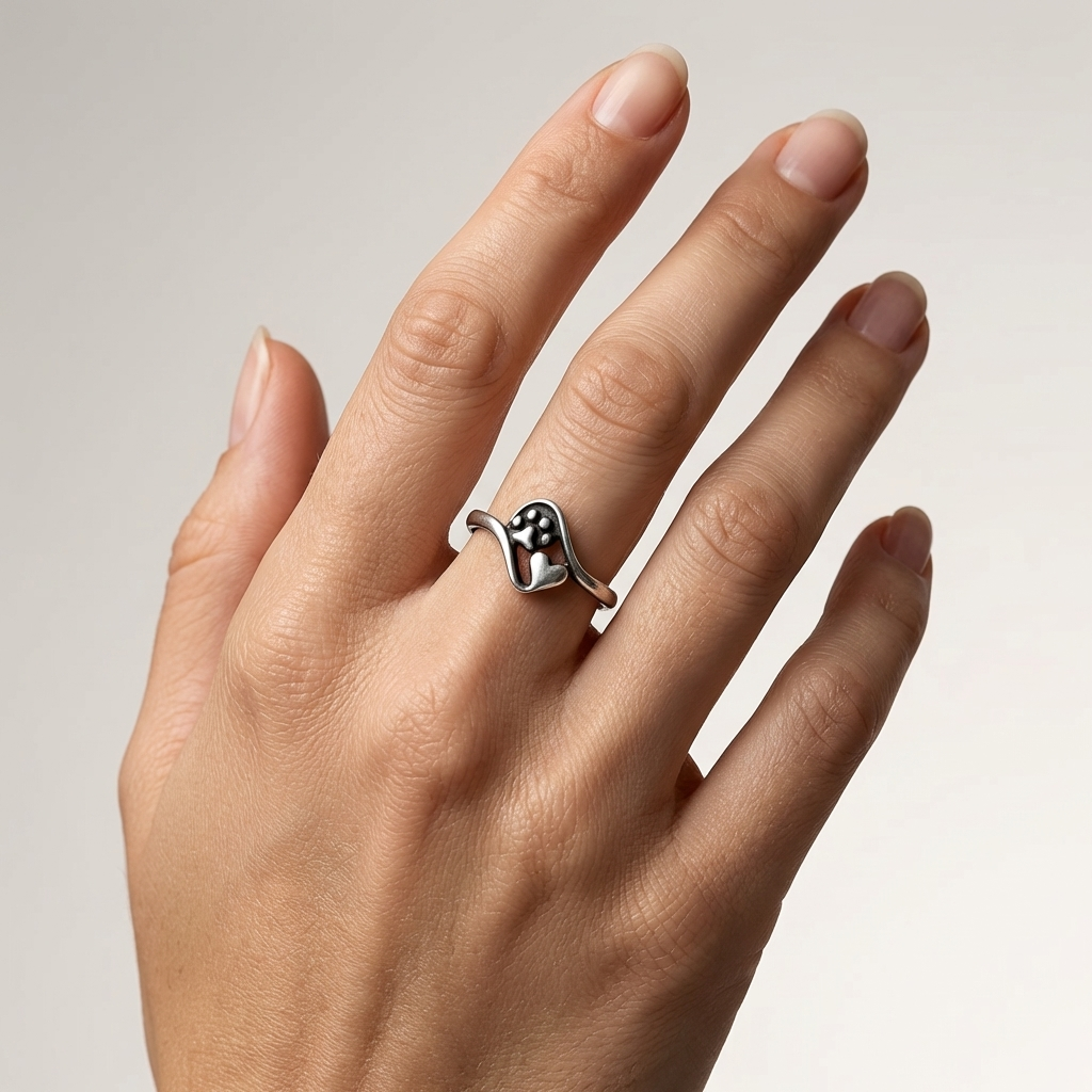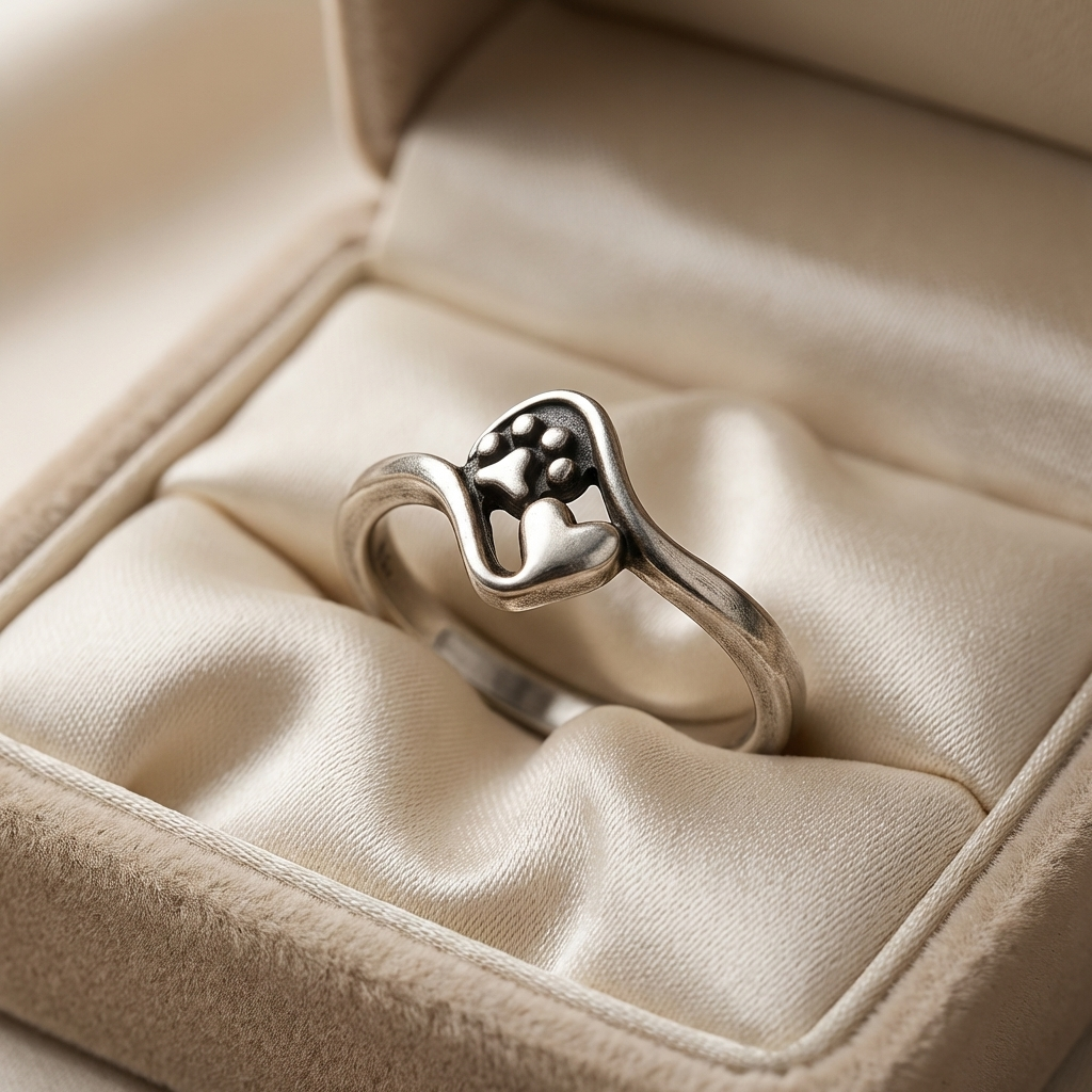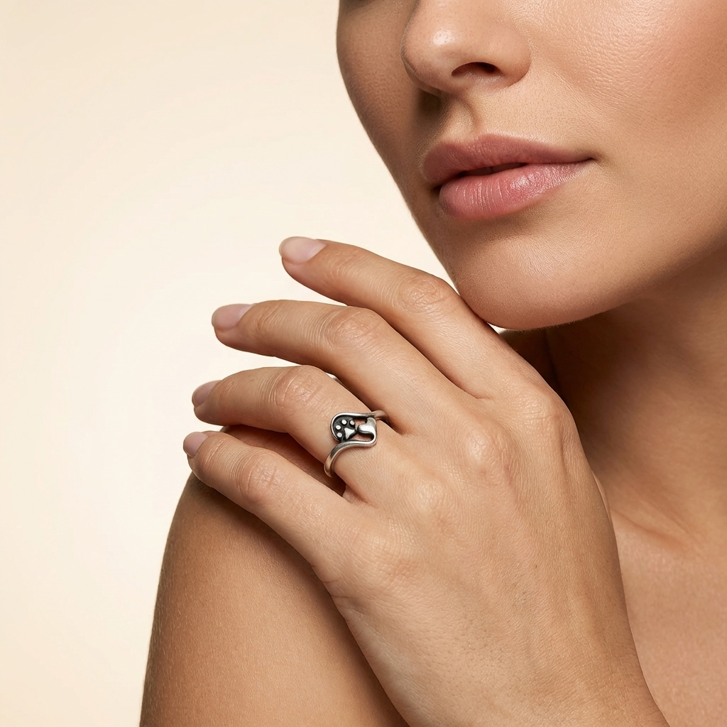 Γιορτάστε την αγάπη με αυτό το όμορφο, χειροποίητο vintage δαχτυλίδι από την Carla's Jewelry! Κατασκευασμένο από πραγματικό ασήμι 925, διακοσμείται με μια κομψή μαύρη καρδιά και ένα σχέδιο πατουσών που συμβολίζει τον ιδιαίτερο δεσμό μεταξύ εσάς και του κατοικίδιού σας.